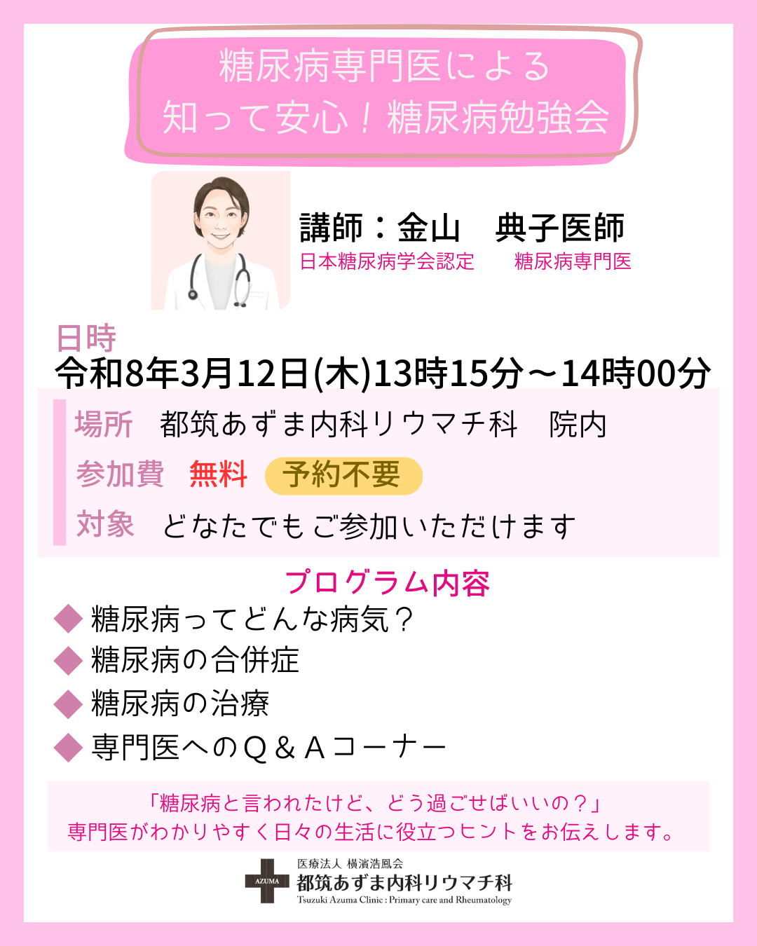令和8年3月12日(木)13時15分より、糖尿病専門医である金山典子医師が講師として、「糖尿病専門医による、知って安心!糖尿病勉強会」を開催いたします。