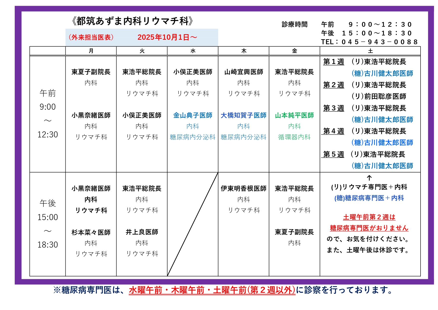 ※小児発熱外来には対応しておりません。<外来担当医表>(2025年10月1日より)