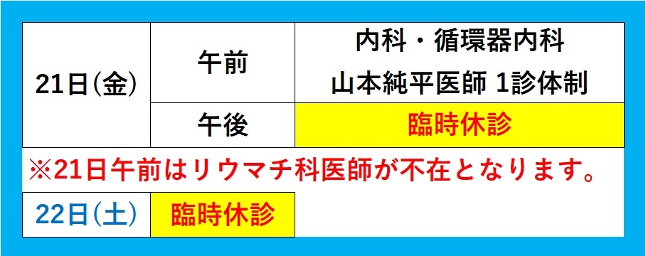 尚、21日午前はリウマチ科医師が不在となりますのでご注意ください。